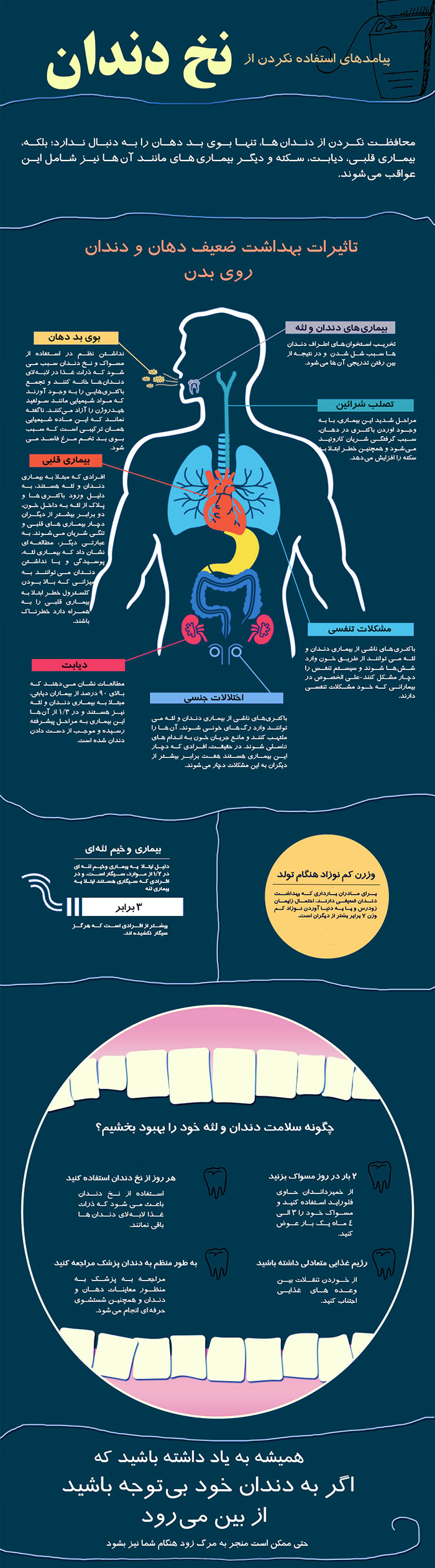 بسیاری از دندان پزشکان توصیه می کنند که به صورت مرتب با استفاده از نخ دندان، لابلای دندان ها تمیز کنیم. در این اینفوگرافی با دلایل مختلف اهمیت این کار و نیز پیامدهای عدم انجام آن آشنا می شویم.
